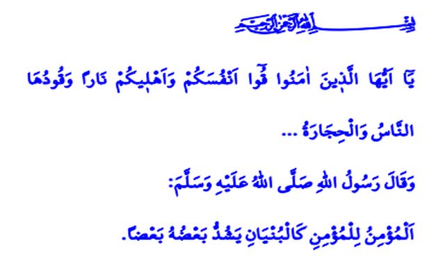 “Ey iman edenler! Kendinizi ve ailenizi yakıtı insanlar ve taşlar olan ateşten koruyun…”